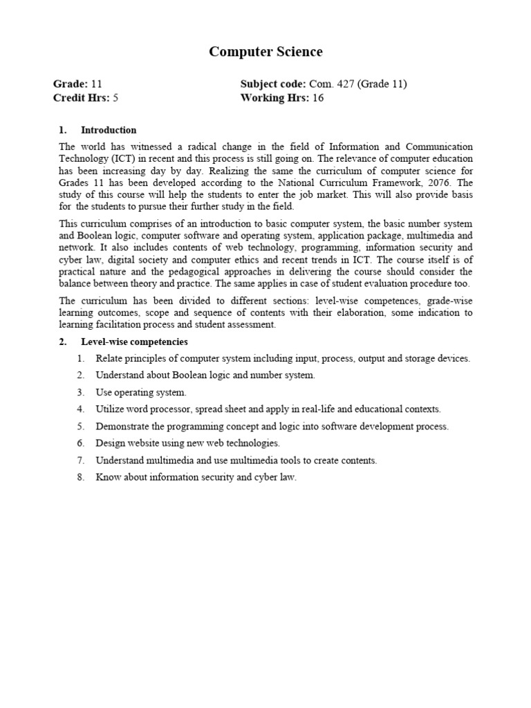 Grades 11 has been developed according to the National Curriculum Framework, 2076. The
