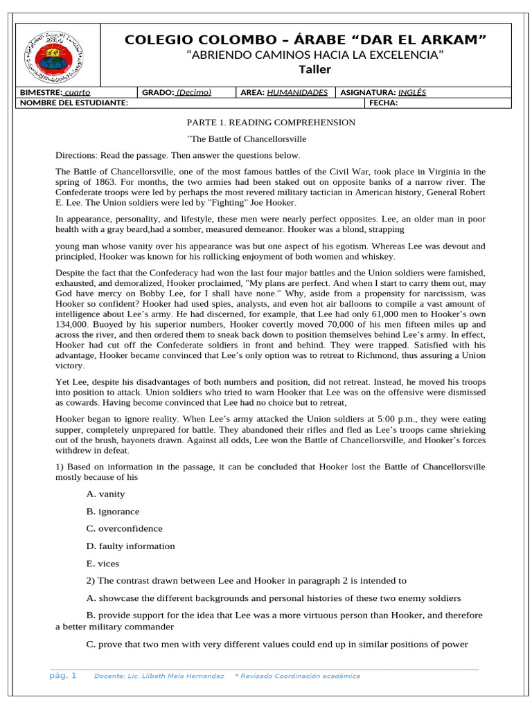1) Based on information in the passage, it can be concluded that Hooker lost the Battle of Chancellorsville