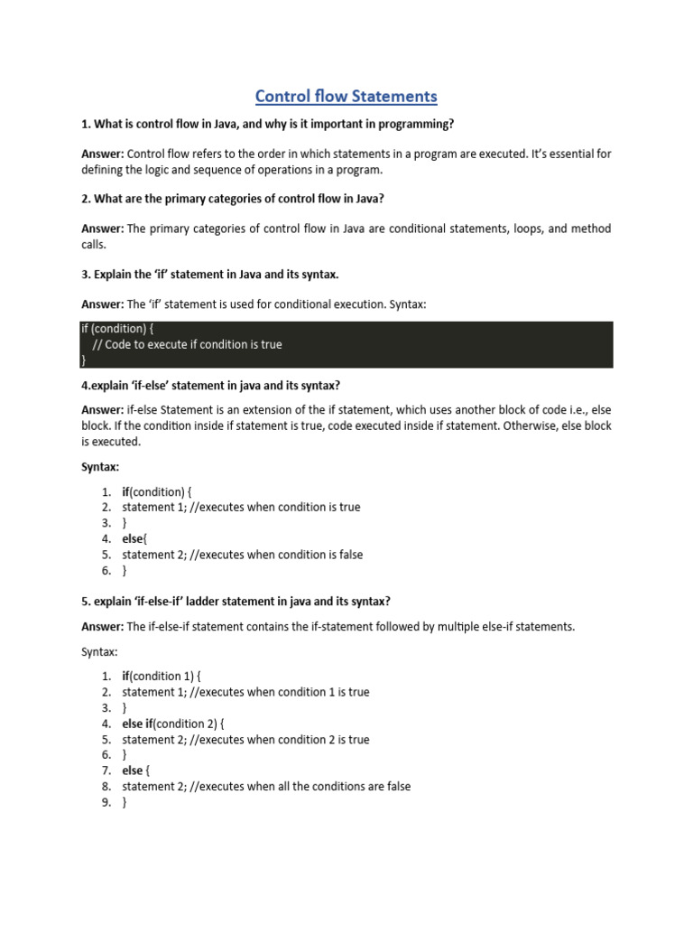 Answer: Control flow refers to the order in which statements in a program are executed. It’s essential for