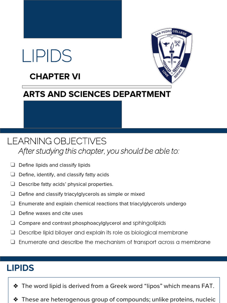 ❏ Define lipids and classify lipids