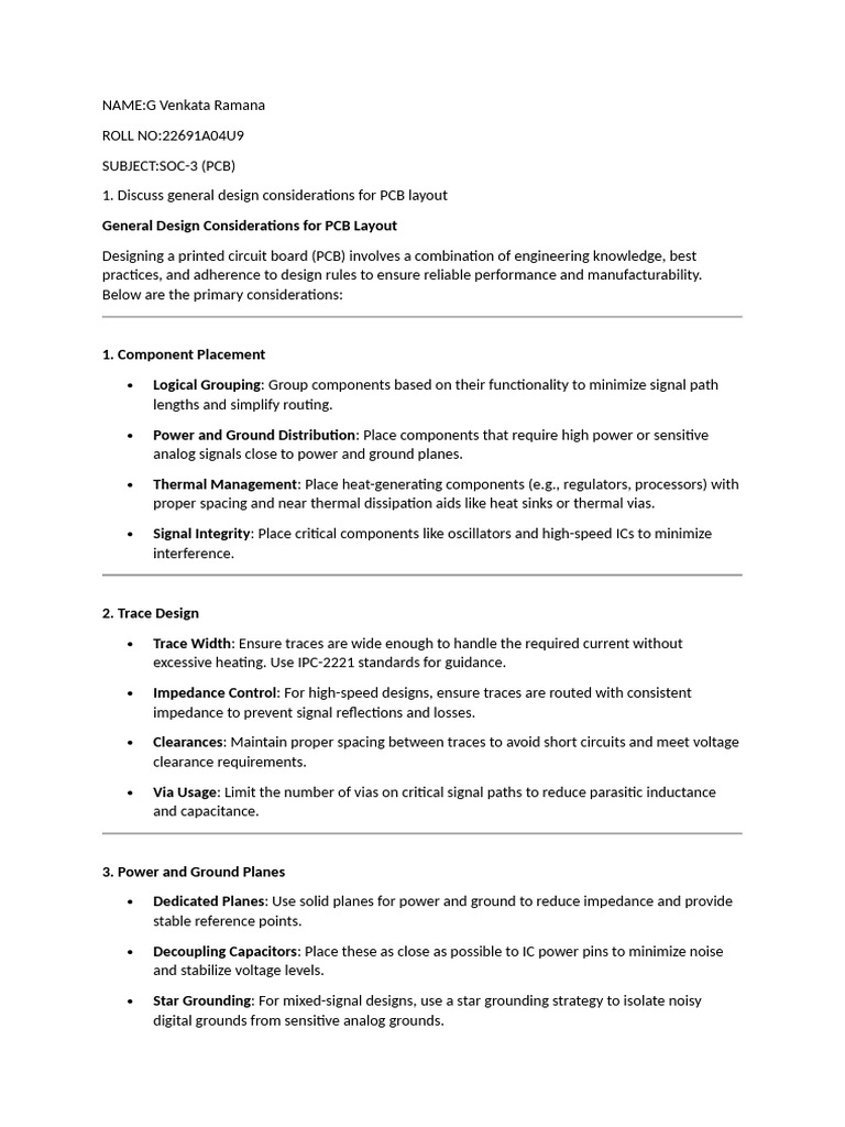 1. Discuss general design considerations for PCB layout