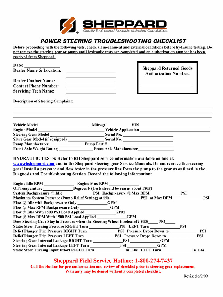 POWER STEERING TROUBLESHOOTING CHECKLIST