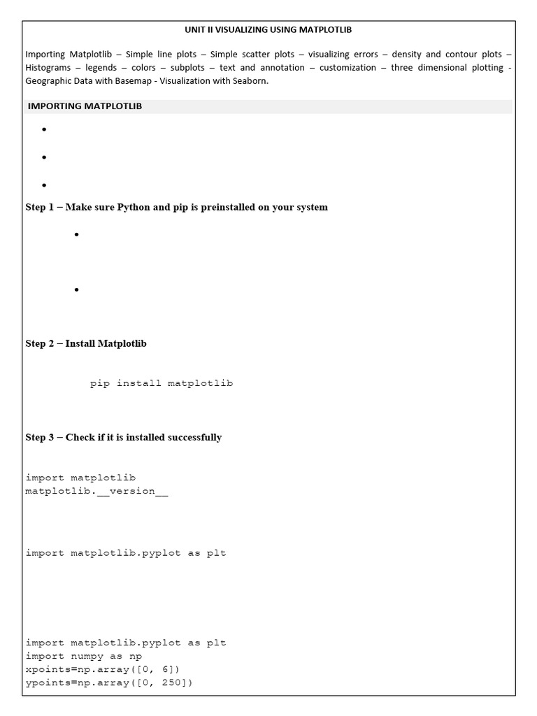 • It is used in data visualization and graphical plotting. To use matplotlib, we need to install it.