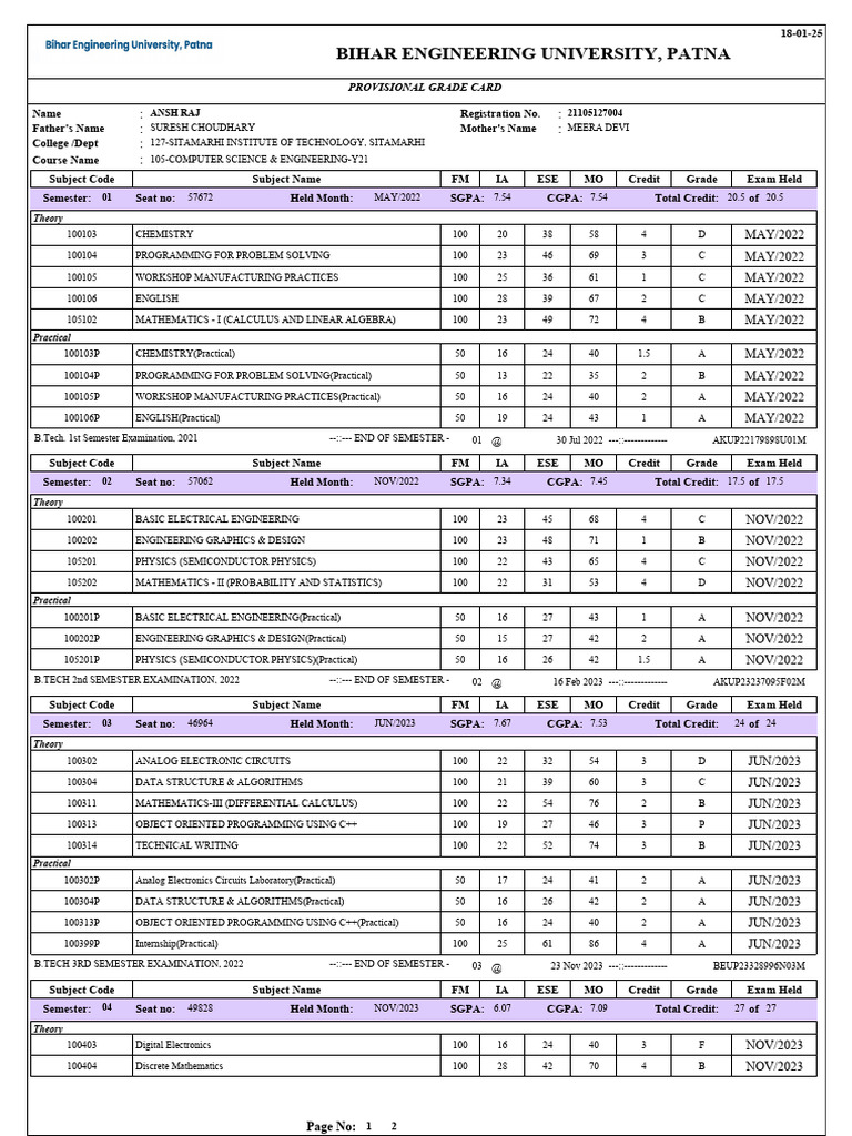 Subject Code Subject Name FM IA ESE MO Credit Grade Exam Held