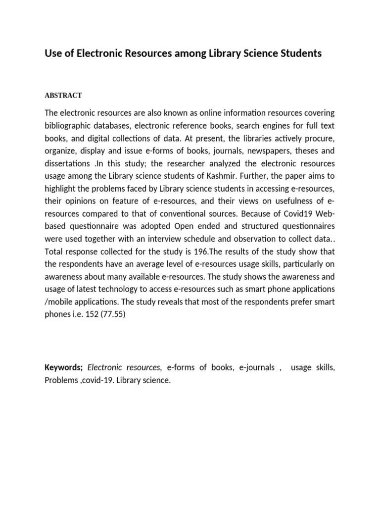 Keywords; Electronic resources, e-forms of books, e-journals , usage skills,
