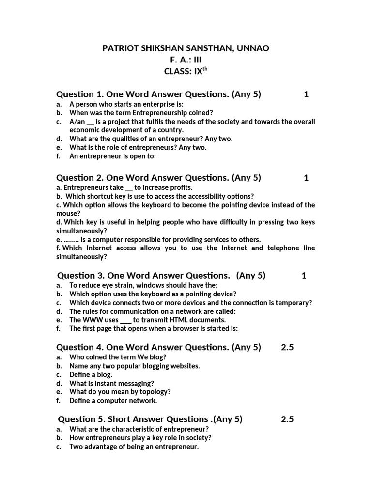 Question 5. Short Answer Questions .(Any 5) 2.5