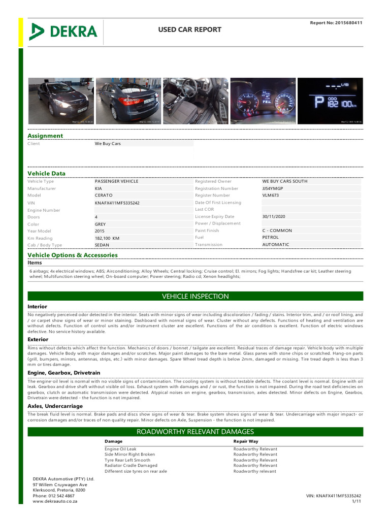 Th is co n ditio n rep o rt is valid o n ly fo r th e describ ed veh icle an d th e describ ed co n ditio n at th e time o f in sp ectio n . DEKRA Terms & Co n ditio n s