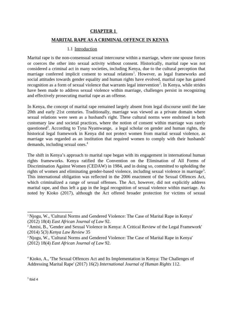 Chapter 1 introduces the research topic of marital rape as an offense in Kenya, highlighting its