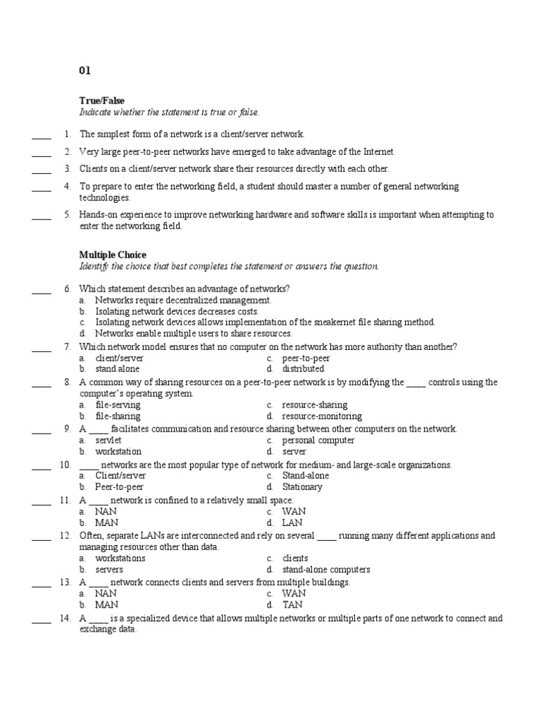 True/False Indicate whether the statement is true or false. ____ ____ ____ ____ ____ 1. The simplest form of a network is a client/server network. 2. Very large peer-to-peer networks have emerged to take advantage of the Internet. 3. Clients on a client/server network share their resources directly with each other. 4. To prepare to enter the networking field, a student should master a number of general networking technologies. 5. Hands-on experience to improve networking hardware and software skills is important when attempting to enter the networking field. Multiple Choice Identify the choice that best completes the statement or answers the question. ____ 6. Which statement describes an advantage of networks? a. Networks require decentralized management. b. Isolating network devices decreases costs. c. Isolating network devices allows implementation of the sneakernet file sharing method. d. Networks enable multiple users to share resources. 7. Which network model ensures that no computer on the network has more authority than another? a. client/server c. peer-to-peer b. stand alone d. distributed 8. A common way of sharing resources on a peer-to-peer network is by modifying the ____ controls using the computers operating system. a. file-serving c. resource-sharing b. file-sharing d. resource-monitoring 9. A ____ facilitates communication and resource sharing between other computers on the network. a. servlet c. personal computer b. workstation d. server 10. ____ networks are the most popular type of network for medium- and large-scale organizations. a. Client/server c. Stand-alone b. Peer-to-peer d. Stationary 11. A ____ network is confined to a relatively small space. a. NAN c. WAN b. MAN d. LAN 12. Often, separate LANs are interconnected and rely on several ____ running many different applications and managing resources other than data. a. workstations c. clients b. servers d. stand-alone computers 13. A ____ network connects clients and servers from multiple buildings. a. NAN c. WAN b. MAN d. TAN 14. A ____ is a specialized device that allows multiple networks or multiple parts of one network to connect and exchange data.