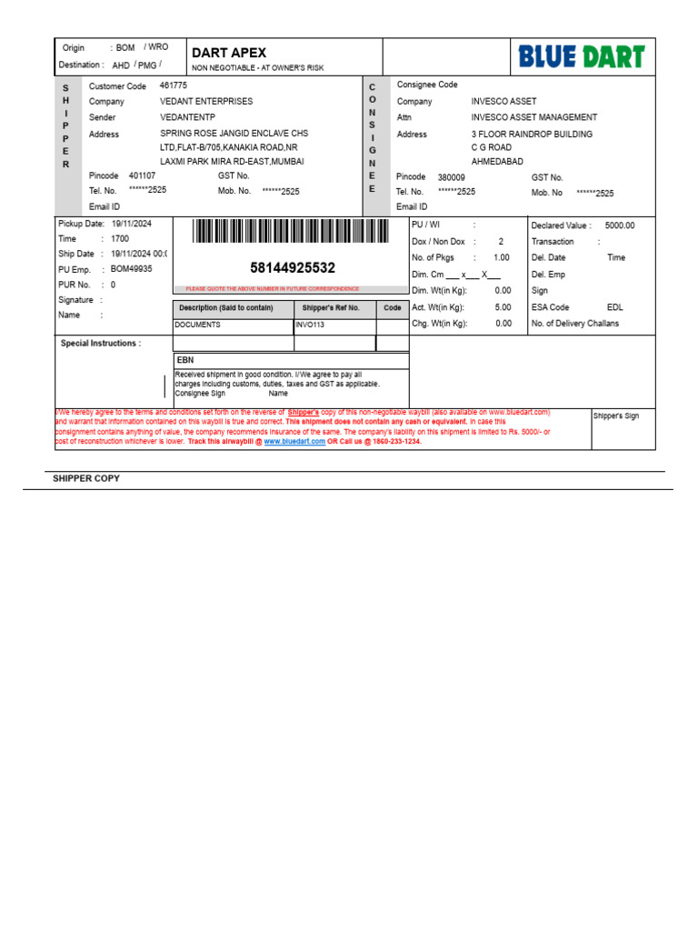 DOCUMENTS INVO113 Chg. Wt(in Kg): 0.00 No. of Delivery Challans