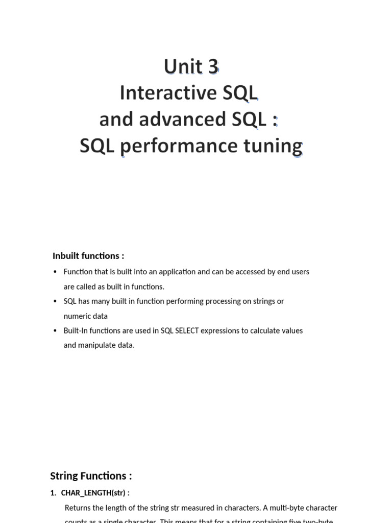 • SQL has many built in function performing processing on strings or