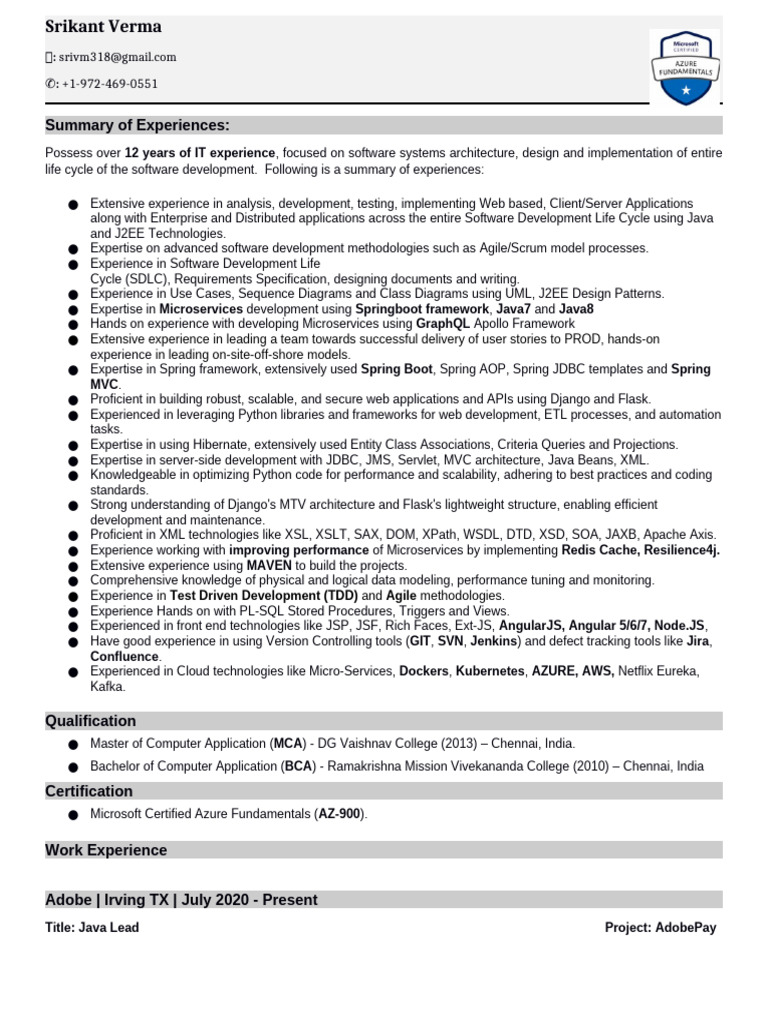 ● Experienced in Cloud technologies like Micro-Services, Dockers, Kubernetes, AZURE, AWS, Netflix Eureka,