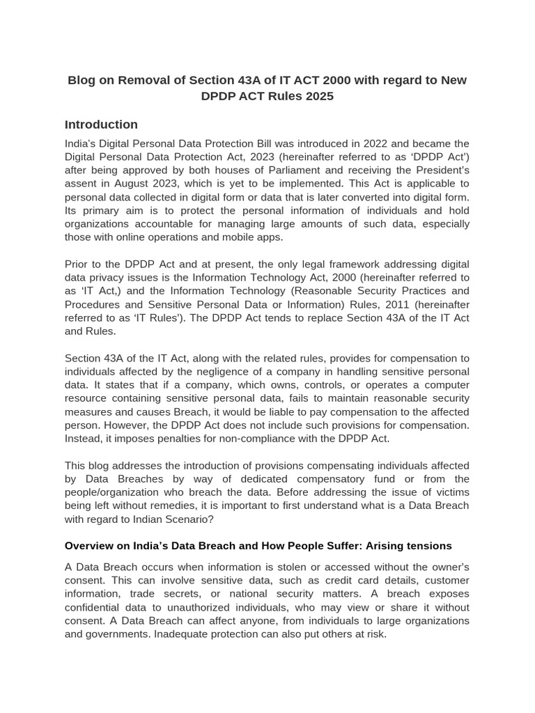 Blog on Removal of Section 43A of IT ACT 2000 with regard to New
