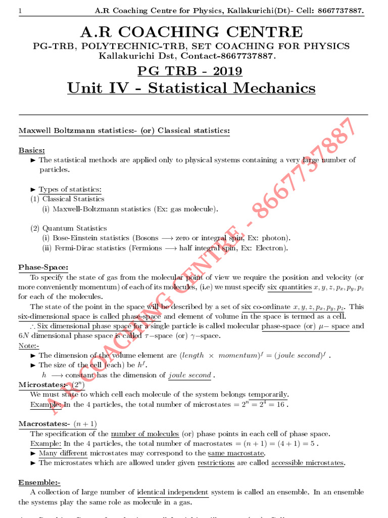 Unit IV - Statistical Mechanics