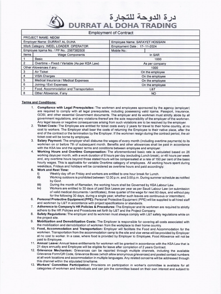 Employer Name: DURRAT AL OUIIA Employee Name: SAFAYET HGSSAIN