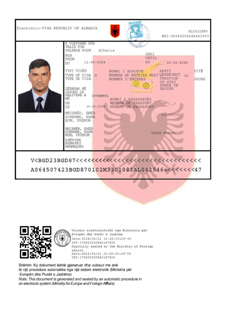 The document is an electronic visa approval for Tarok Mandal from Bangladesh, valid from September 25, 2024, to September 24, 2025, allowing a stay of 388 days in Albania. It includes details about a job offer for the position of Construction General Helper with a monthly salary of 900 Euros, along with various benefits such as transportation and accommodation. The visa must be presented upon arrival in Albania for verification by the Ministry of Immigration.
