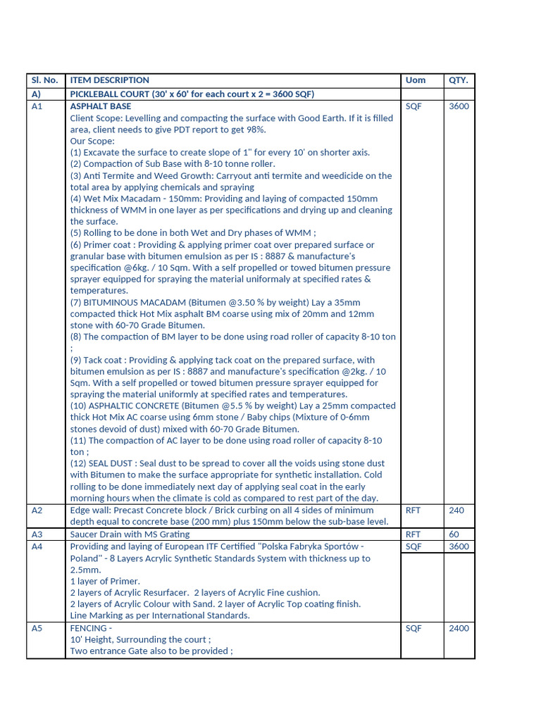 A) PICKLEBALL COURT (30' x 60' for each court x 2 = 3600 SQF)
