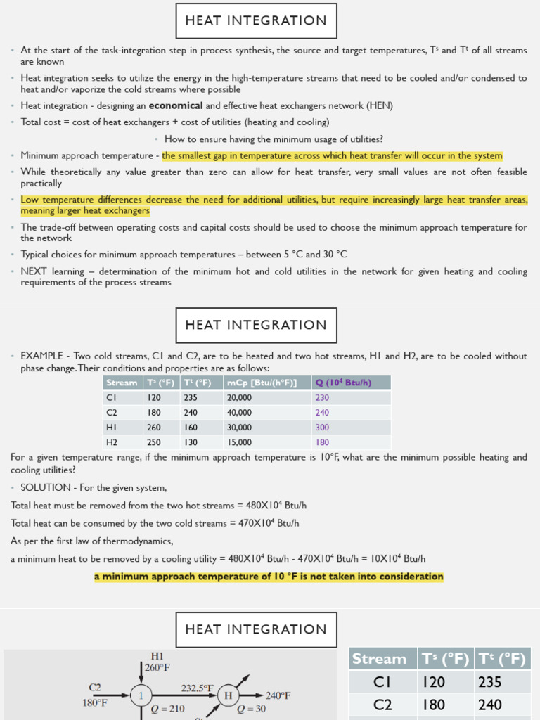 • Heat integration seeks to utilize the energy in the high-temperature streams that need to be cooled and/or condensed to