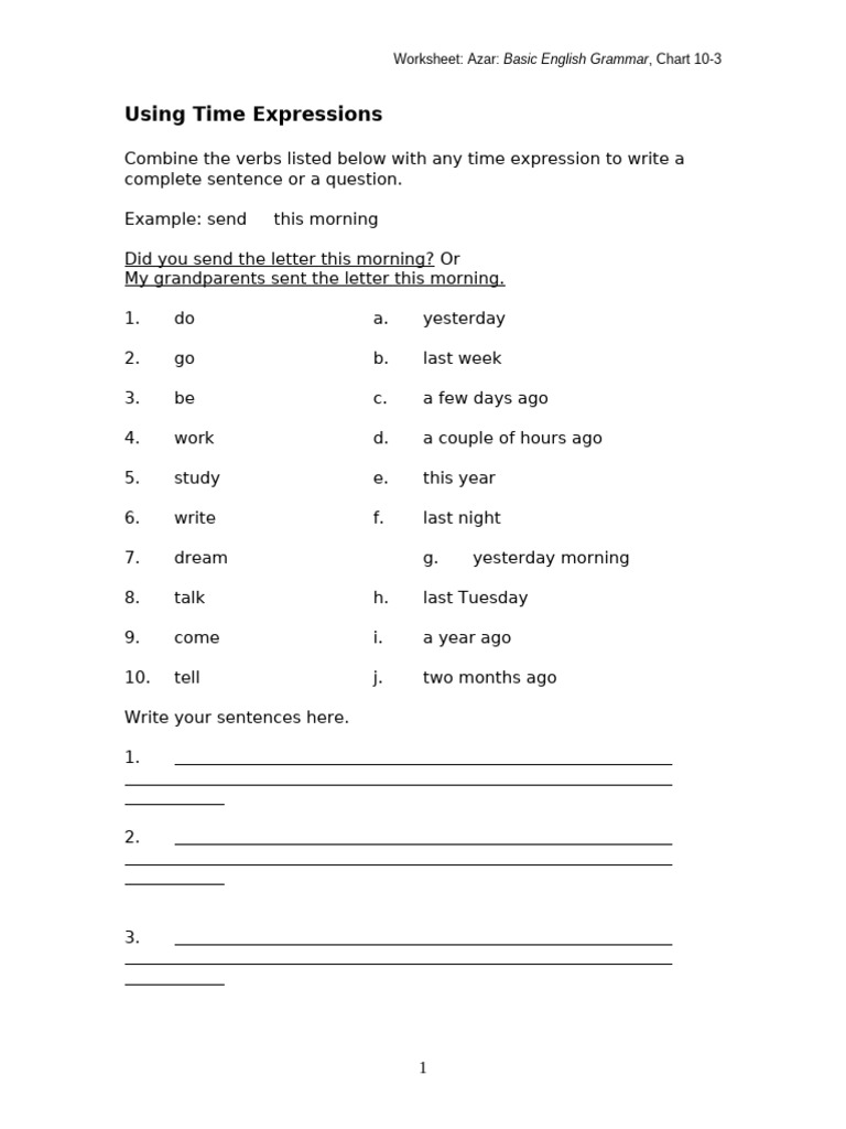 Worksheet: Azar: Basic English Grammar, Chart 10-3