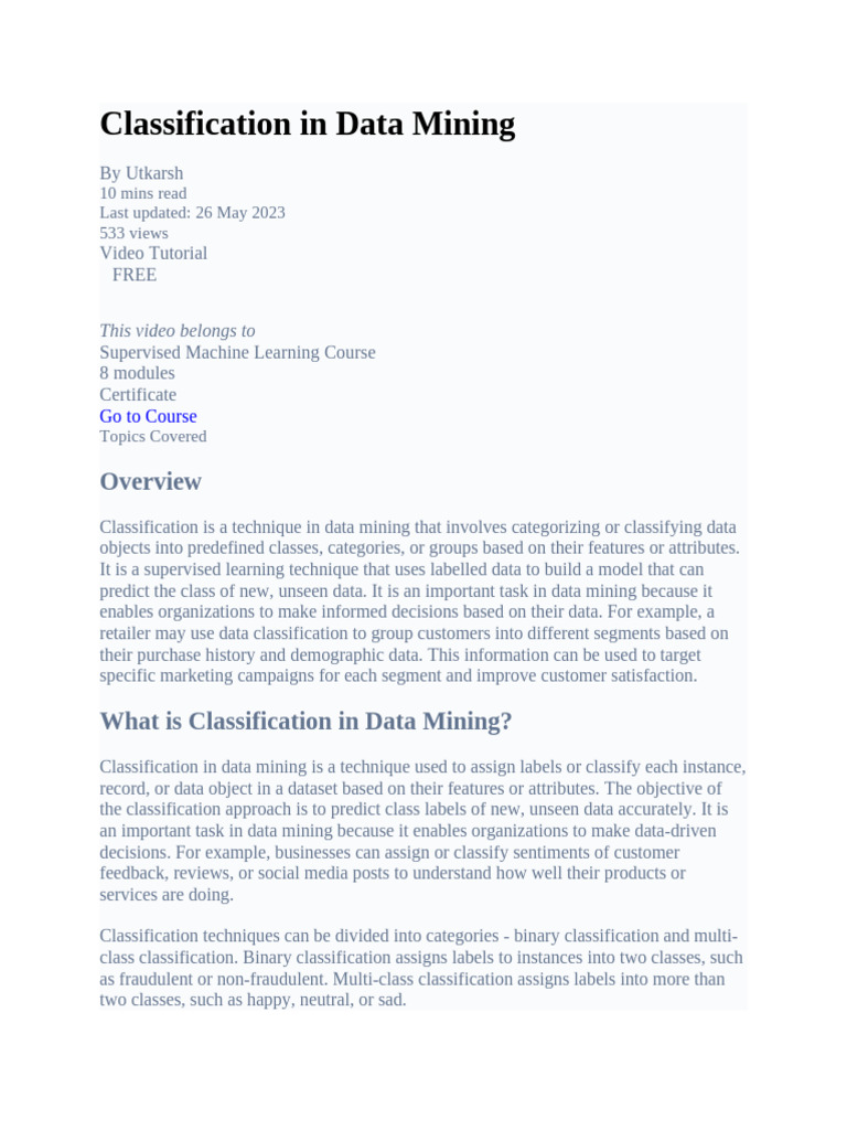Classification in data mining is a technique used to assign labels or classify each instance,