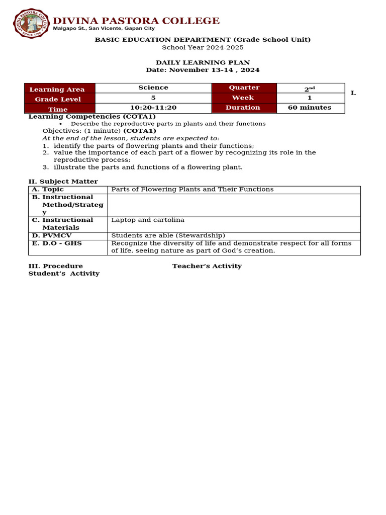 1. identify the parts of flowering plants and their functions;