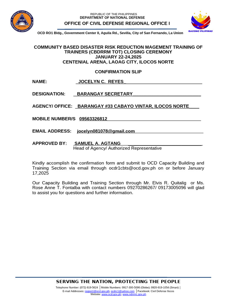 Kindly accomplish the confirmation form and submit to OCD Capacity Building and