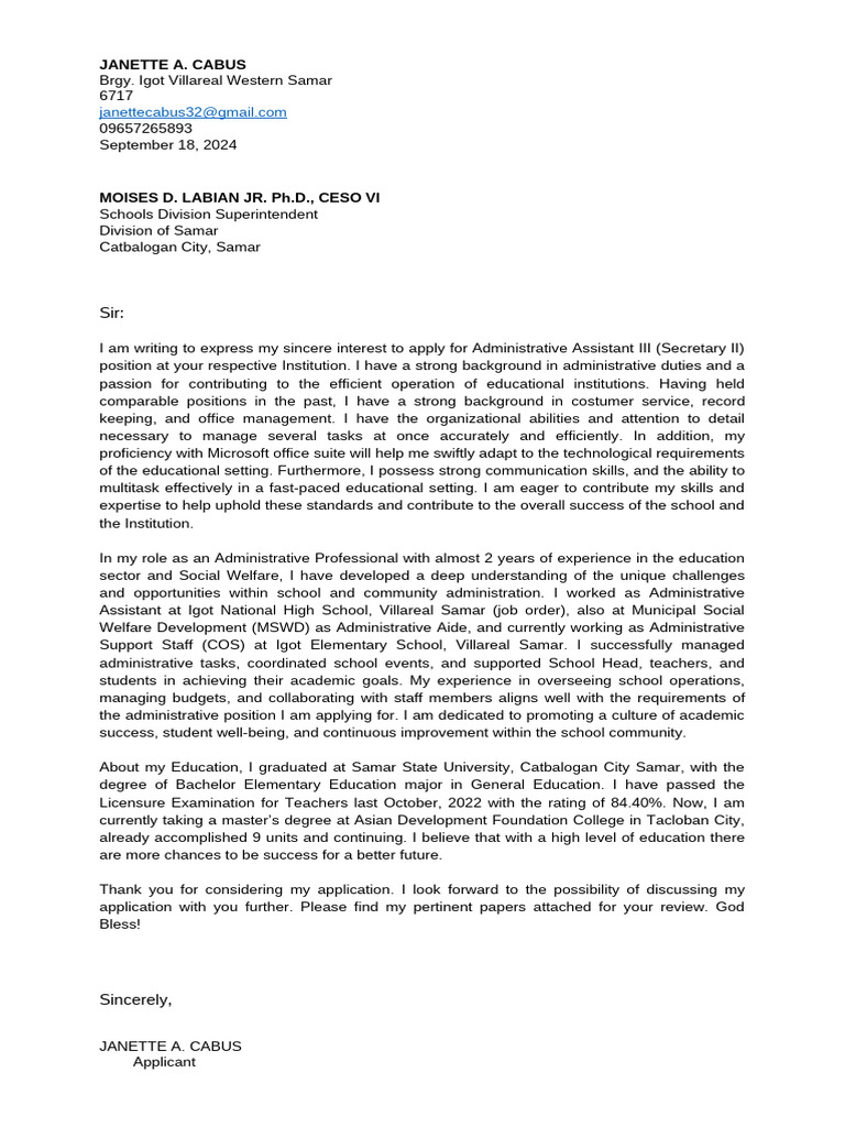 I am writing to express my sincere interest to apply for Administrative Assistant III (Secretary II)