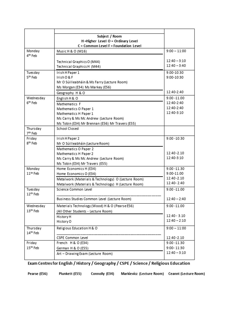 Date Junior Certificate Mock Examinations 2019 Time