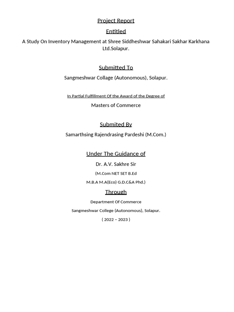 report entitled, “A Study On Inventory Management at Shree Siddheshwar Sahakari Sakhar