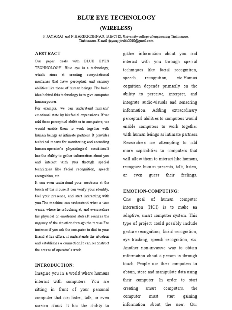 providing more delicate and user friendly facilities in computing devices. Now that we have proven the method, the next step is to improve the hardware.Instead of using cumbersome modules to gather information about the user, it will be better to use smaller and less intrusive units. REFERENCE: www.wherisdoc.com www.fixya.com www.penniblack56.gratisphphost.info/ blue-eyes-technology www.scribd.com/doc/13763040/BlueEyes-Technology