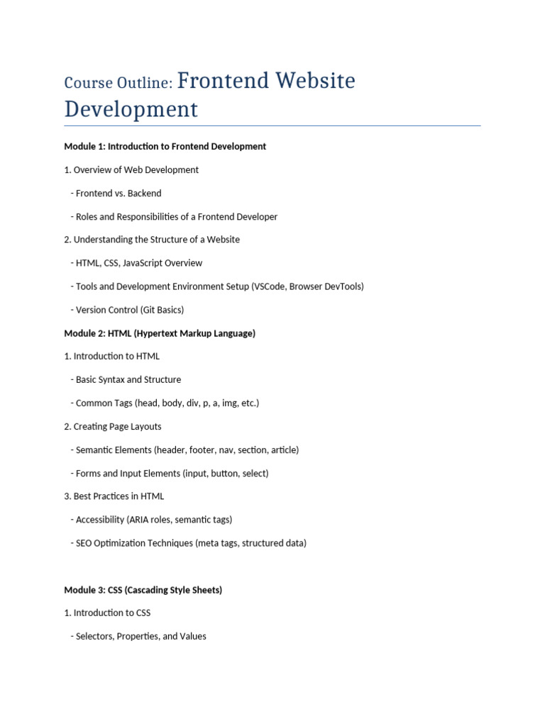 This course outline provides a comprehensive foundation for mastering frontend development, covering