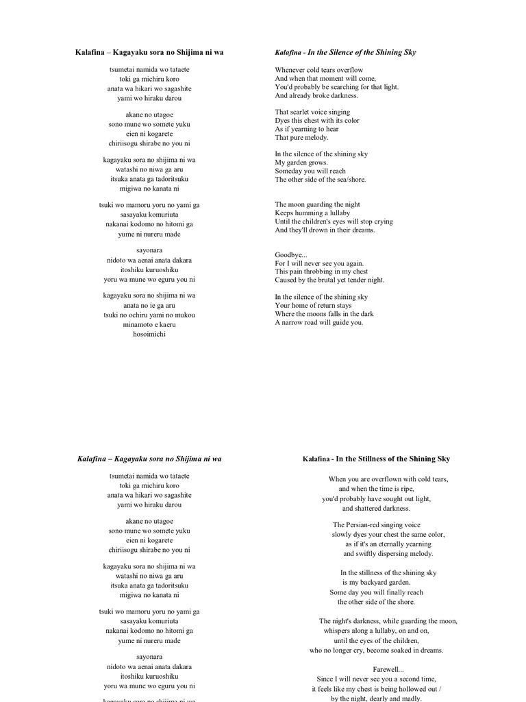 Kalafina - In the Stillness of the Shining Sky When you are overflown with cold tears, and when the time is ripe, you'd probably have sought out light, and shattered darkness. The Persian-red singing voice slowly dyes your chest the same color, as if it's an eternally yearning and swiftly dispersing melody. In the stillness of the shining sky is my backyard garden. Some day you will finally reach the other side of the shore. The night's darkness, while guarding the moon, whispers along a lullaby, on and on, until the eyes of the children, who no longer cry, become soaked in dreams. Farewell... Since I will never see you a second time, it feels like my chest is being hollowed out / by the night, dearly and madly. In the stillness of the shining sky / is your home of return. Beyond the darkness where the moon sinks / is a narrow path that leads you / back to the beginning.