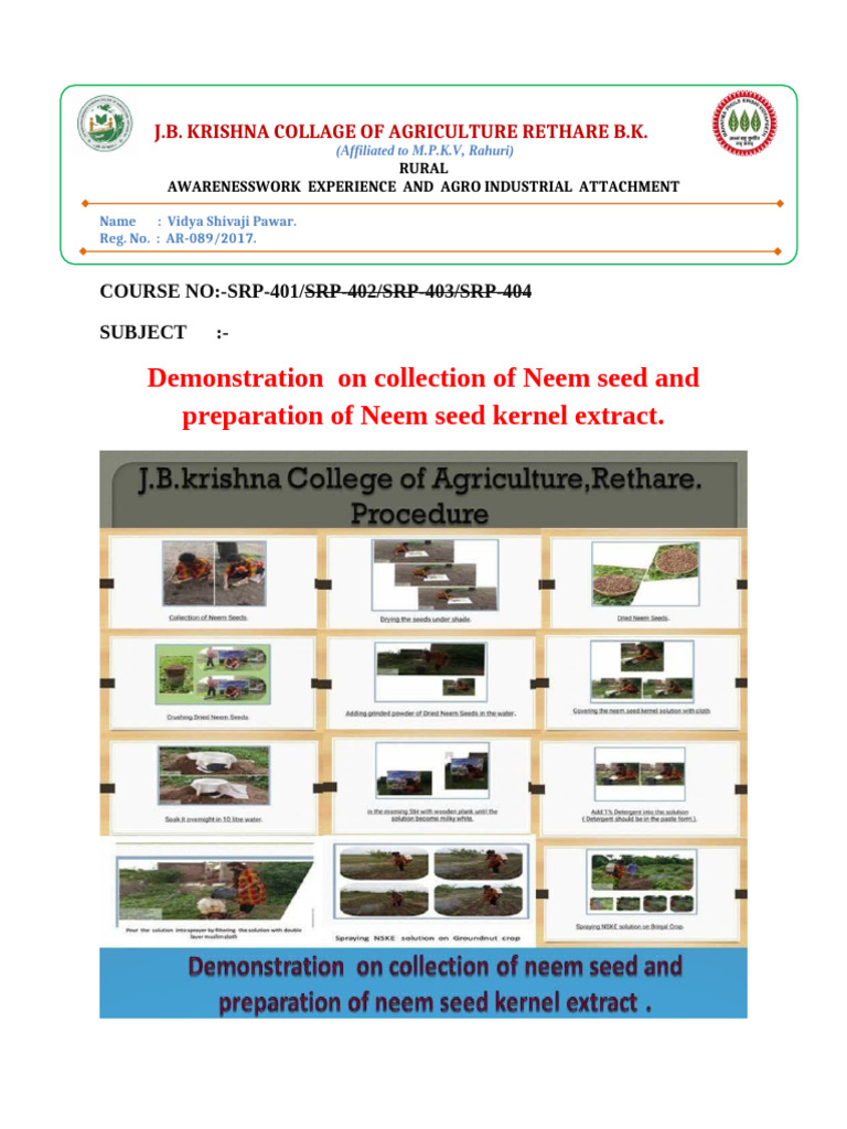 1. to collect Neem seed for preparation of 5% kernel extract for controlling