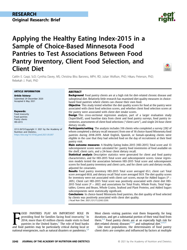 security status for rural, midwestern food pantry clients. J Acad Nutr Minneapolis, MN: University of Minnesota; 2019.