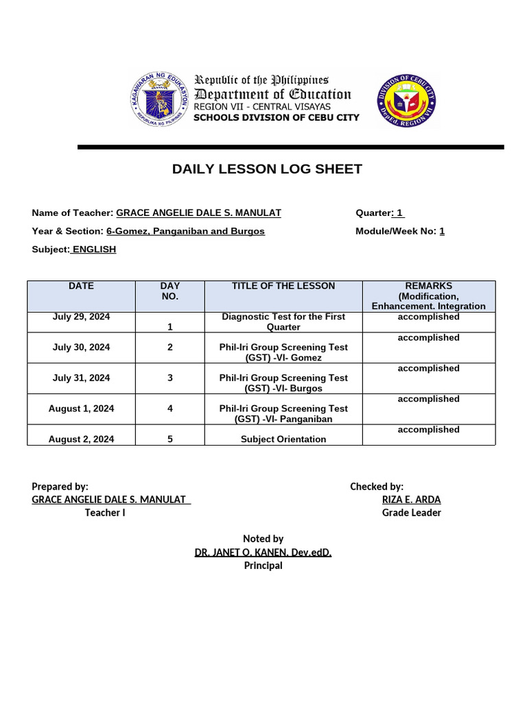 Name of Teacher: GRACE ANGELIE DALE S. MANULAT Quarter: 1