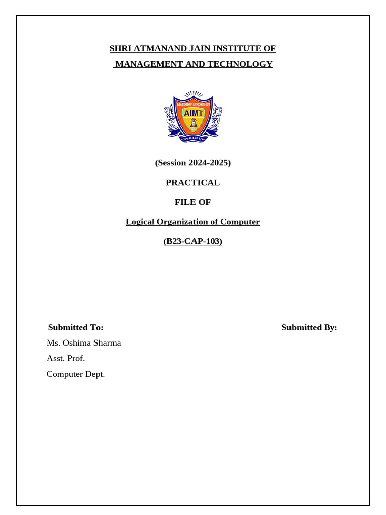 This document is a practical file for the course 'Logical Organization of Computer' for the session 2024-2025 at Shri Atmanand Jain Institute of Management and Technology. It is submitted by a student to Ms. Oshima Sharma, an Assistant Professor in the Computer Department.