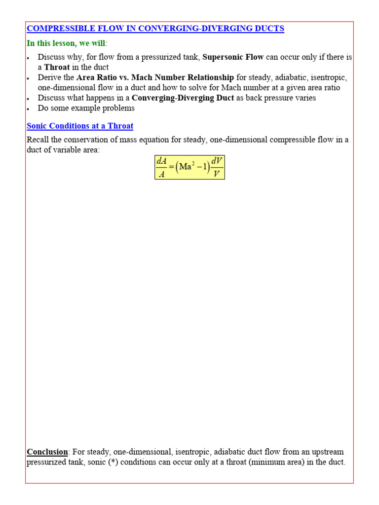• Derive the Area Ratio vs. Mach Number Relationship for steady, adiabatic, isentropic,