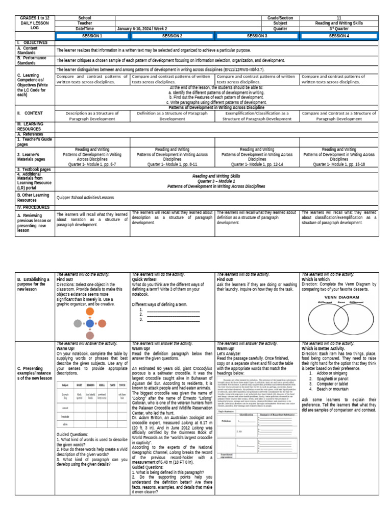 about the lesson description? How do they differ ● What are the tree types of definition? developing our paragraphs? organize comparison/contrast