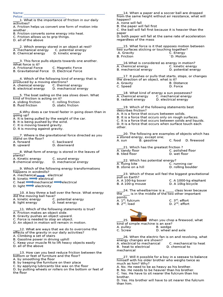 bottom or feet of furniture and the floor? ____27. Will it possible for a boy in a seesaw to balance