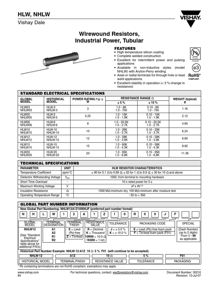 GLOBAL MODEL HLW03 NHLW03 HLW05 NHLW05 HLW06 NHLW06 HLW10 NHLW10 HLW12 NHLW12 HLW15 NHLW15 HLW20 NHLW20 HISTORICAL MODEL HLW-3 NHLW-3 HLW-5 NHLW-5 HLW-6 NHLW-6 HLW-10 NHLW-10 HLW-12 NHLW-12 HLW-15 NHLW-15 HLW-20 NHLW-20 POWER RATING P25 C W 3 5.25 8 10 12 15 20 RESISTANCE RANGE 5% 1.0 - 6K 1.0 - 700 1.0 - 15K 1.0 - 1.9K 1.0 - 20.5K 1.0 - 2.7K 1.0 - 29K 1.0 - 3.7K 1.0 - 58K 1.0 - 3.9K 1.0 - 60K 1.0 - 4.3K 1.0 - 95K 1.0 - 6.8K 10 % 0.10 - 6K 1.0 - 700 0.10 - 15K 1.0 - 1.9K 0.10 - 20.5K 1.0 - 2.7K 0.10 - 29K 1.0 - 3.7K 0.10 - 58K 1.0 - 3.9K 0.10 - 58K 1.0 - 4.3K 0.10 - 95K 1.0 - 6.8K WEIGHT (typical) g 1.16 2.12 4.60 6.24 6.60 8.82 11.36