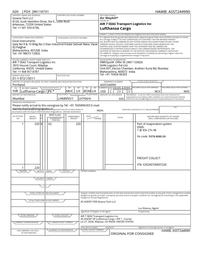 Givana Tech LLC Air Waybill*