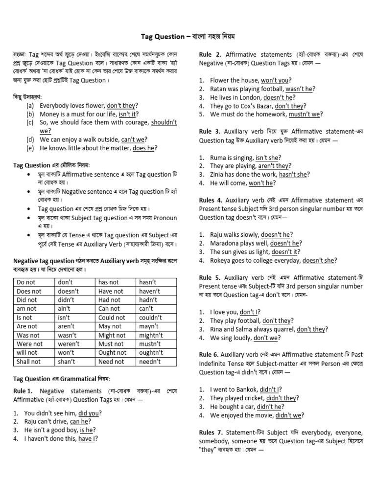 cªkœ Ry‡o †`Iqv‡K Tag Question e‡j| mvaviYZ †Kvb GKwU evK¨ Ôn¨vu Negative (bv-†evaK) Question Tags nq| †hgb —