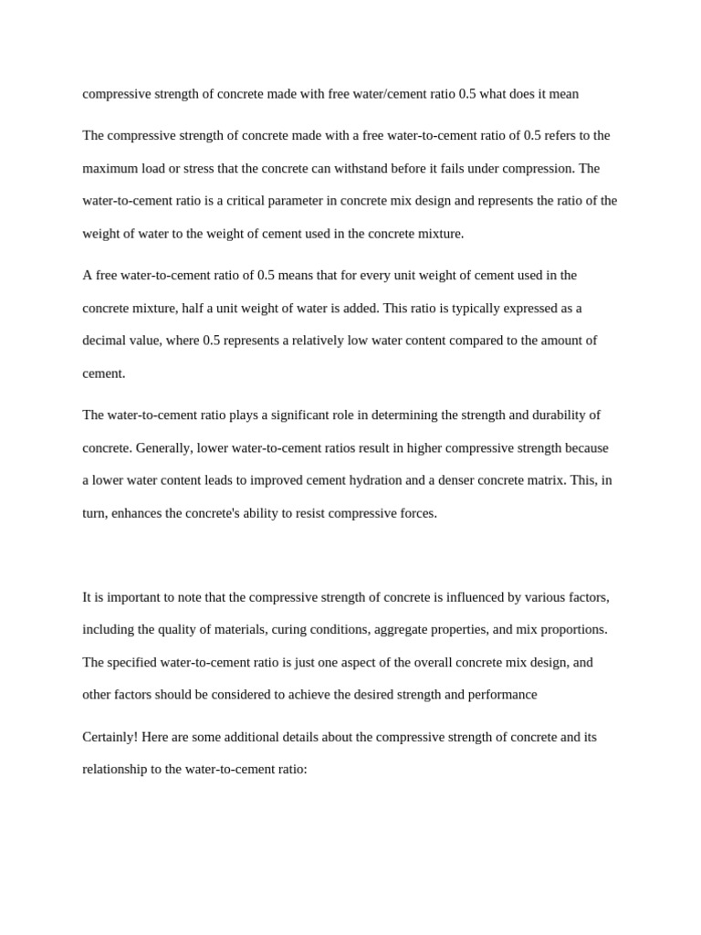concrete. Generally, lower water-to-cement ratios result in higher compressive strength because