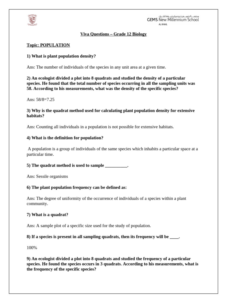 3) Why is the quadrat method used for calculating plant population density for extensive