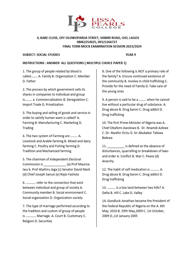 SUBJECT: SOCIAL STUDIES YEAR 9
