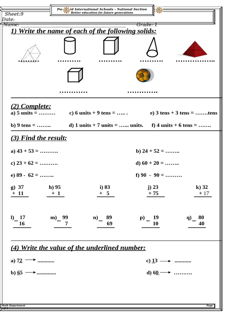 c) 23 + 62 = ………. d) 60 + 20 = ……..