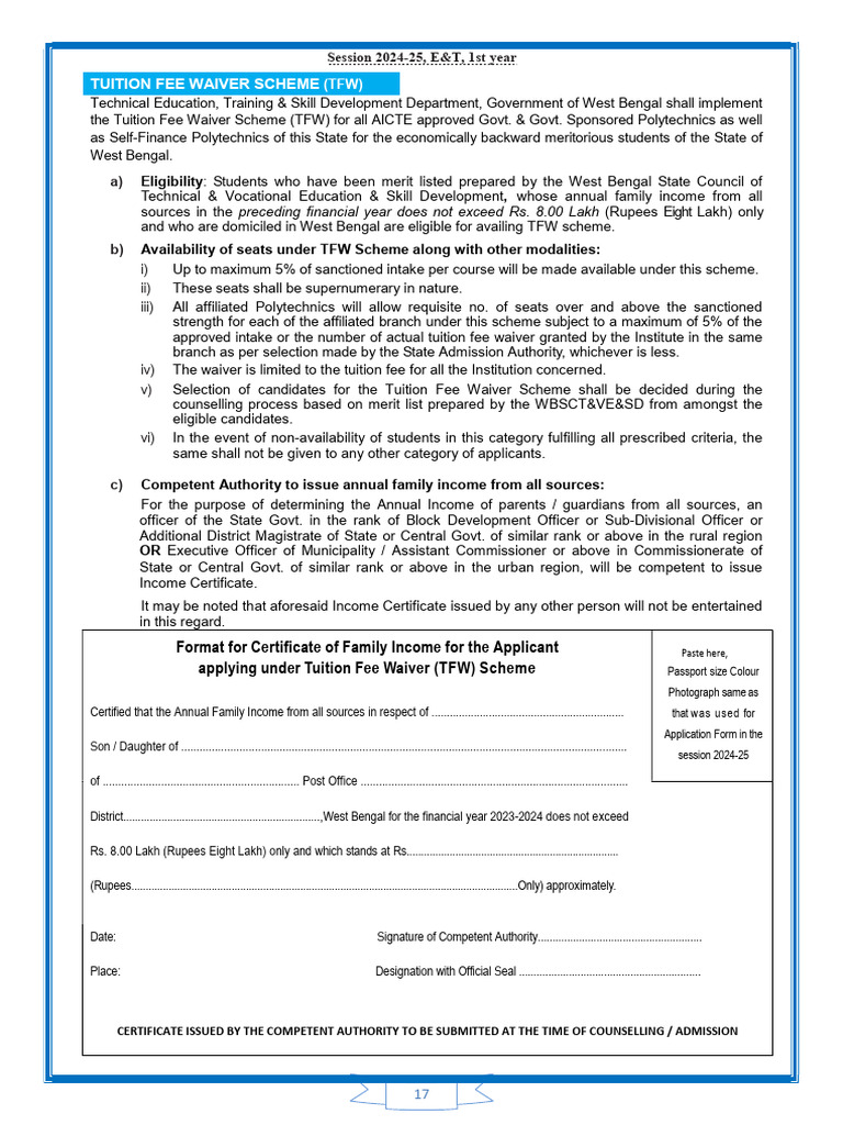 the Tuition Fee Waiver Scheme (TFW) for all AICTE approved Govt. & Govt. Sponsored Polytechnics as well