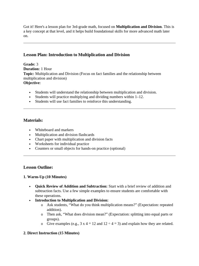 Got it! Here's a lesson plan for 3rd-grade math, focused on Multiplication and Division.