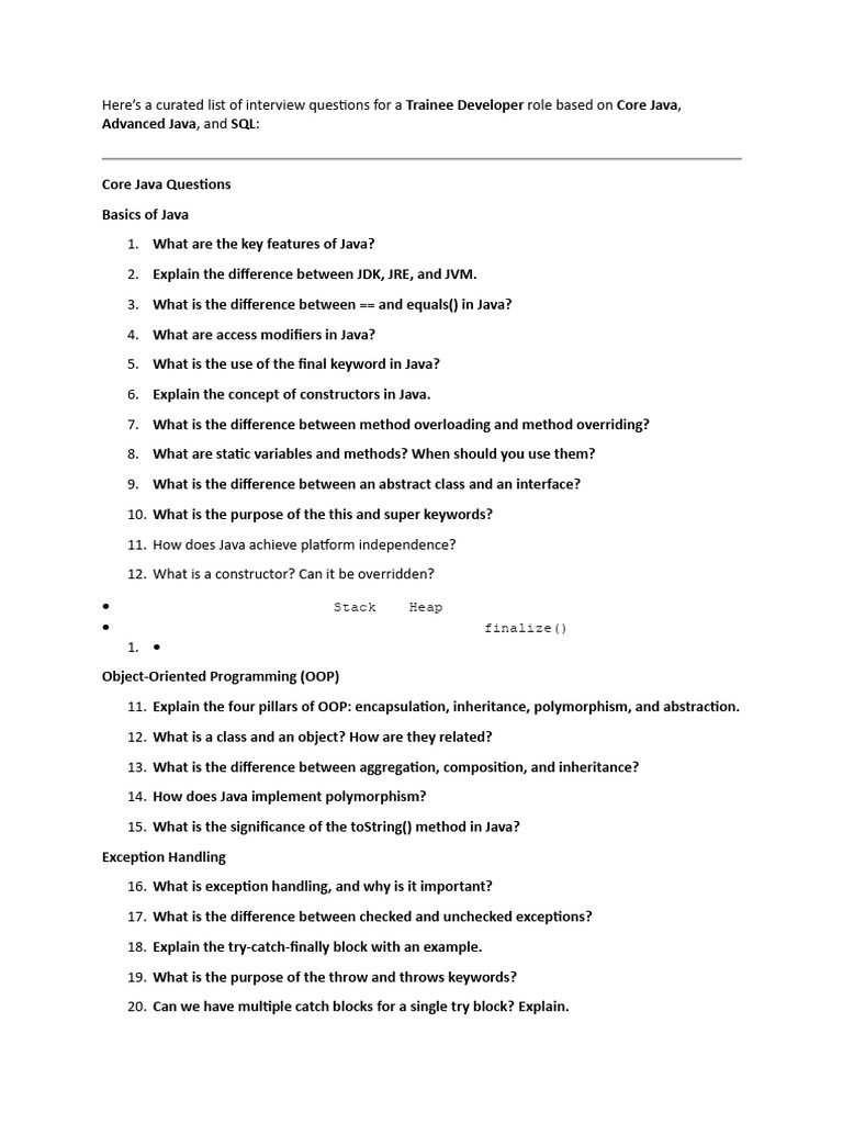 Here’s a curated list of interview questions for a Trainee Developer role based on Core Java,