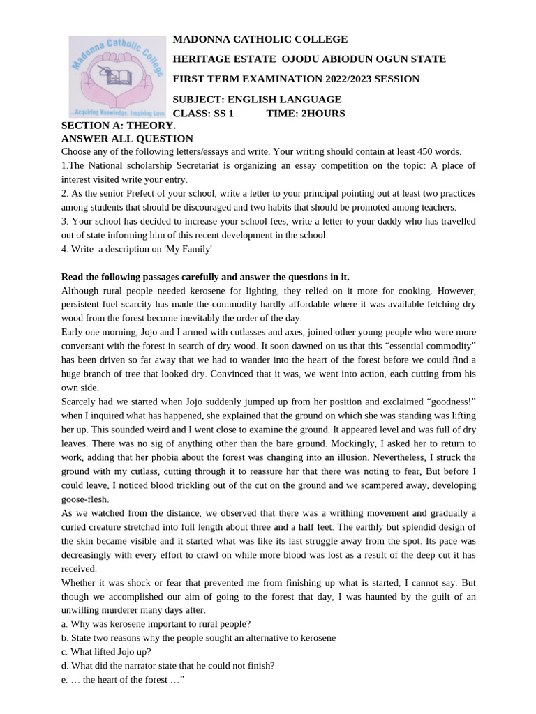 CLASS: SS 1 TIME: 2HOURS